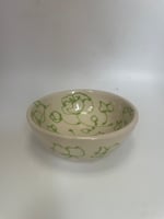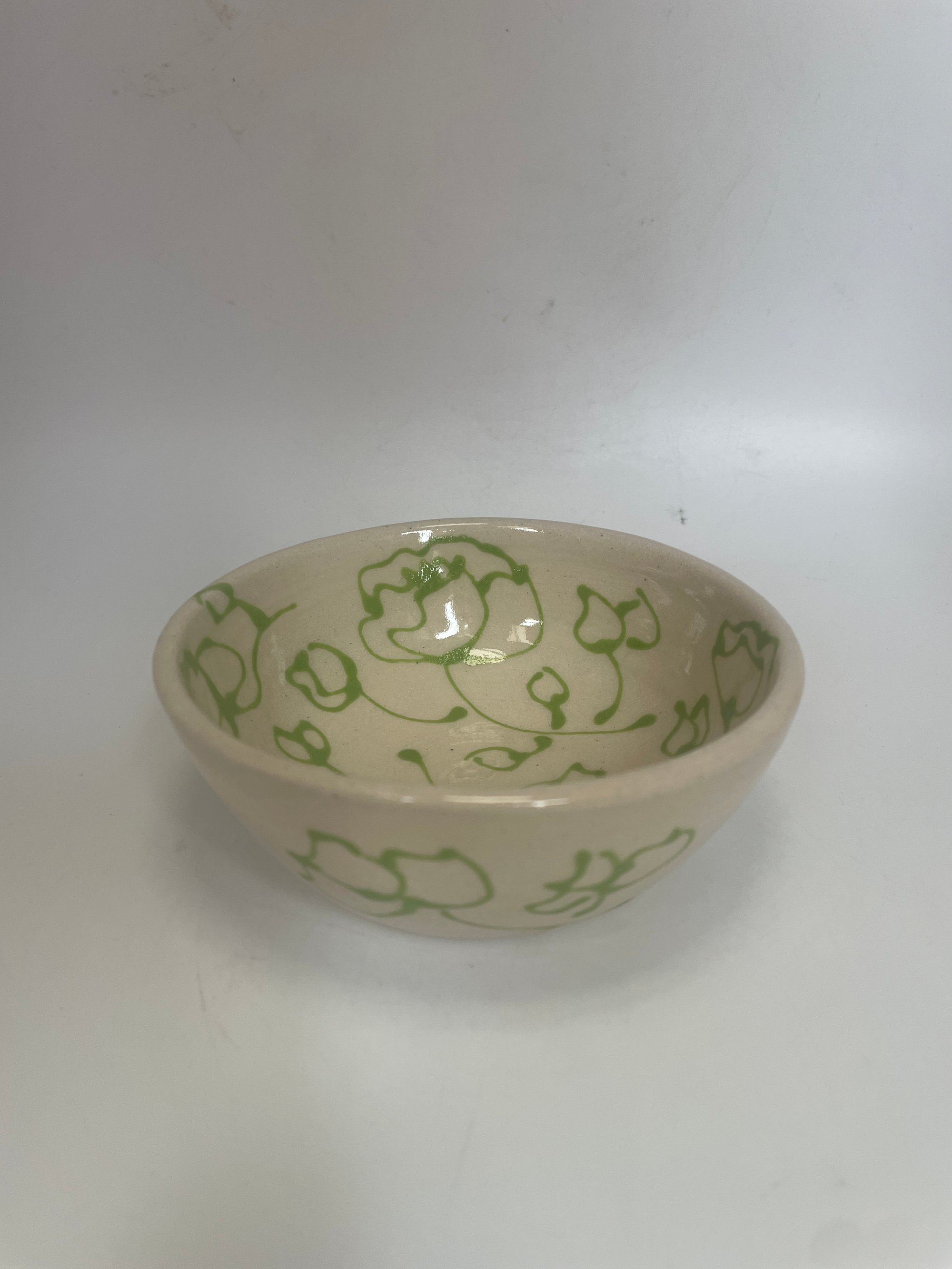 Small wheel thrown dish in an off white stoneware with light green floral design